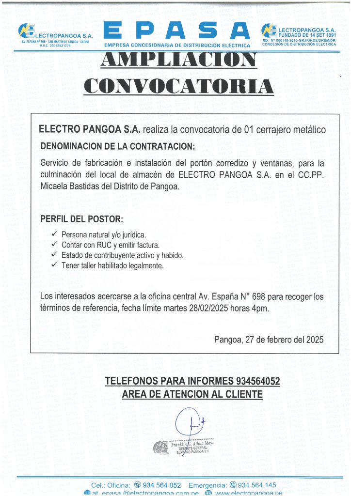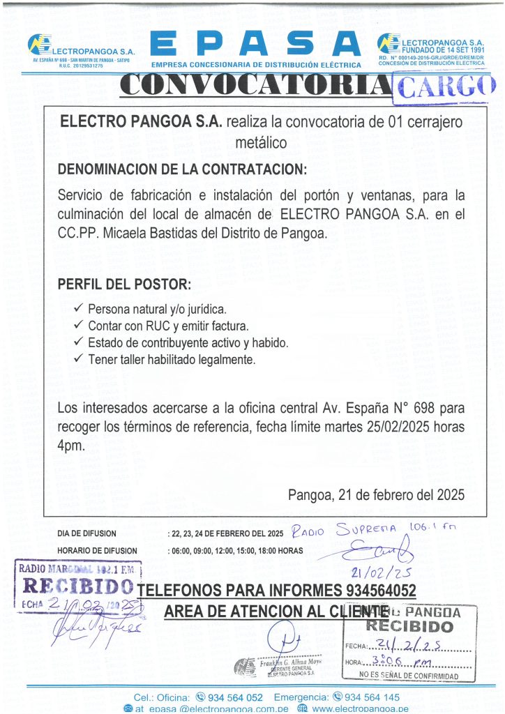 ELECTRO PANGOA S.A. REALIZA LA CONVOCATORIA DE 01 CERRAJERO METALICO: DENOMINACION DE LA CONTRATACION: SERVICIO DE FABRICACION E INSTALACION DEL PORTON Y VENTANAS, PARA LA CULMINACION DEL LOCAL DE ALMACEN DE ELECTRO PANGOA S.A. EN EL CC.PP. MICAELA BASTIDAS DEL DISTRITO DE PANGOA. PERFIL DEL POSTOR: LOS INTERESADOS ACERCARSE A LA OFICINA CENTRAL AV. ESPAÑA N° 698 PARA RECOGER LOS TERMINOS DE REFERENCIA, FECHA LIMITE MARTES 28/02/2025 HORAS 4PM.