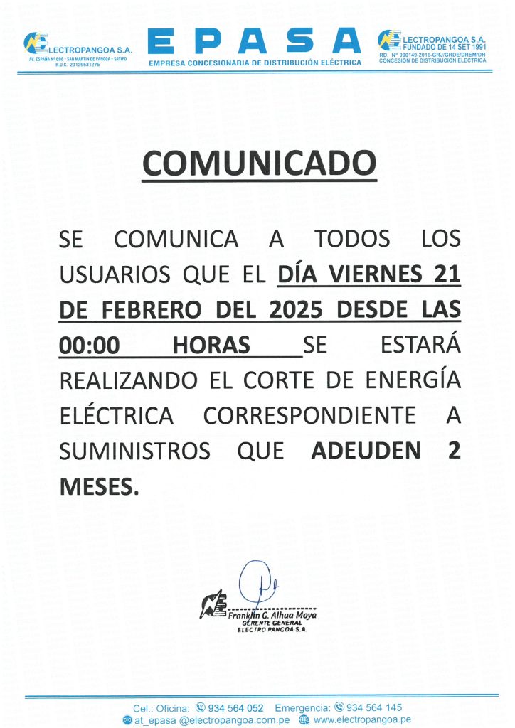 SE COMUNICA A TODO LOS USUARIOS QUE EL DIA VIERNES 21 DE FEBRERO DEL 2025 DESDE LAS 00:00 HORAS SE ESTARA REALIZANDO EL CORTE DE ENERGIA ELECTRICA CORRESPONDIENTE A SUMINISTROS QUE ADEUDEN 2 MESES