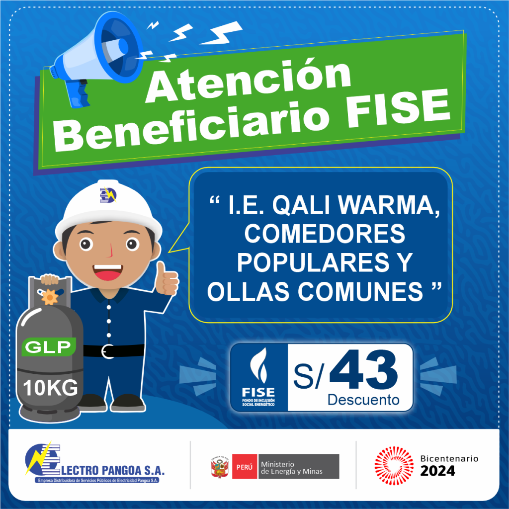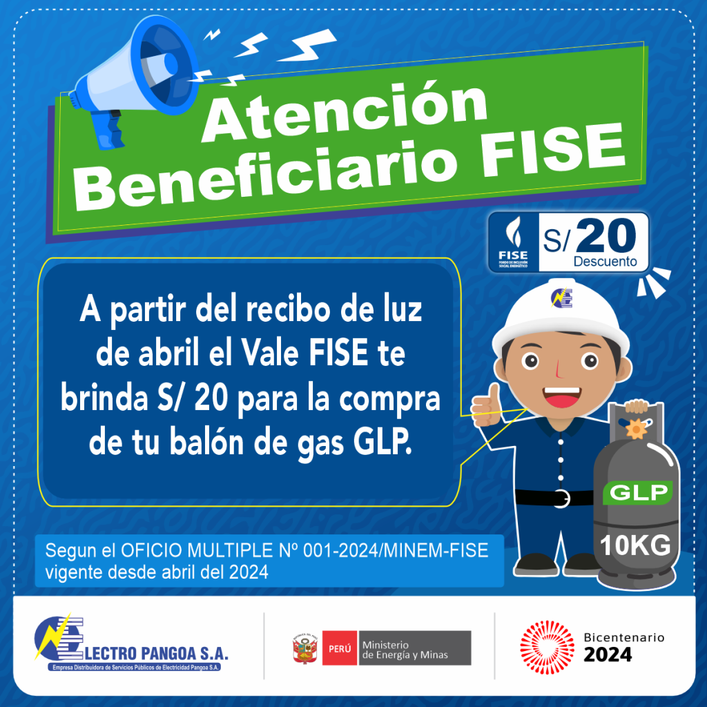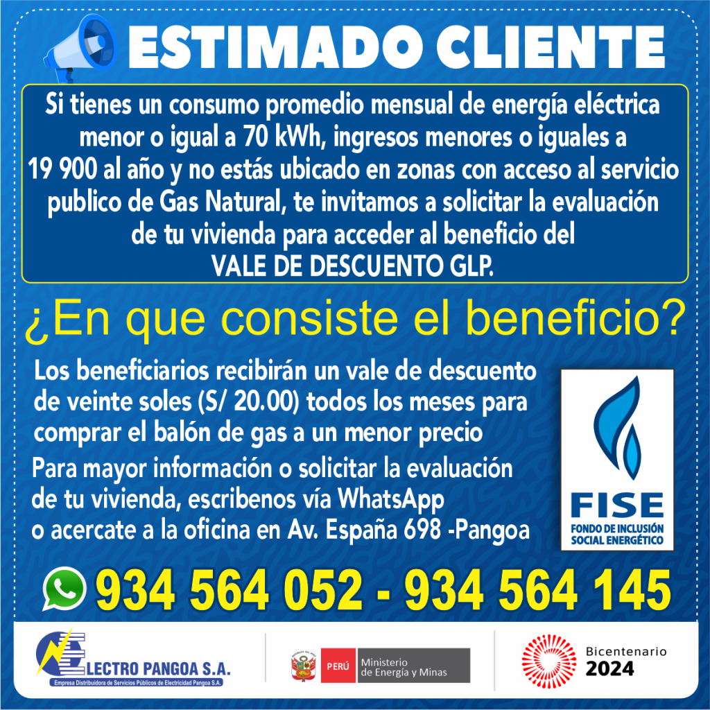 Si tu consumo mensual promedio en los últimos 12 meses es menor o igual a 70 KWh, y acreditas tener cocina a GLP y te registras en el padrón de beneficiarios FISE de la distribuidora eléctrica, se te entregará, junto con tu recibo mensual de consumo de electricidad, un vale de descuento para la adquisición del balón de GLP.
